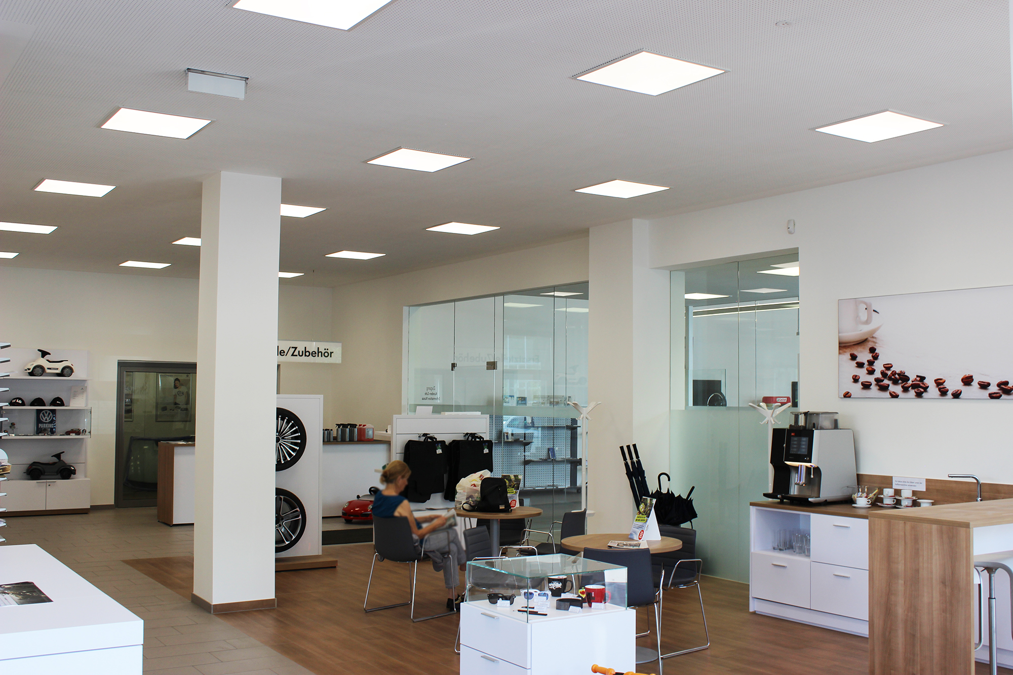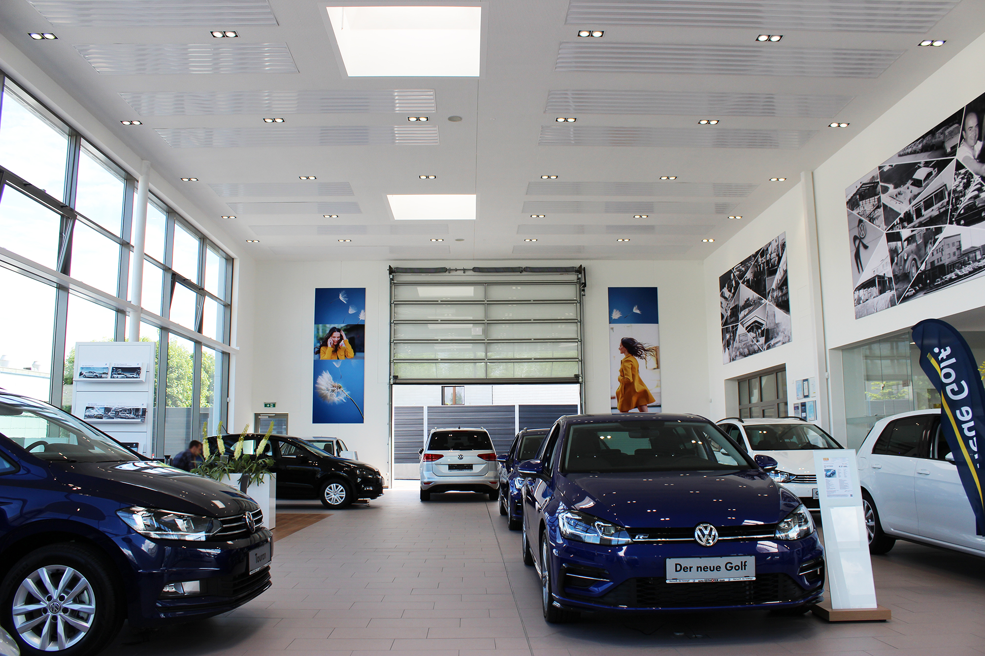 Both to support the thoroughly modern atmosphere of the VW showroom and in terms of a flexible lighting solution, the client and planners opted for the modular SYSTEM SUPERSHOP system luminaire.