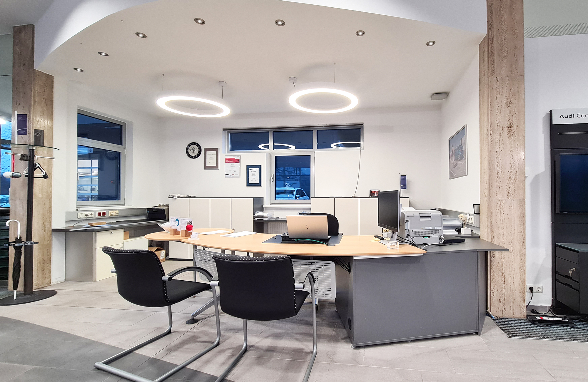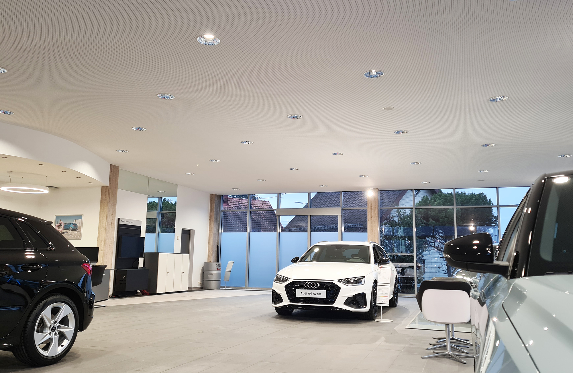 The implementation was carried out in close cooperation with the management and the in-house electrician. The focus was on effective, modern and accentuated lighting for the Audi showroom.