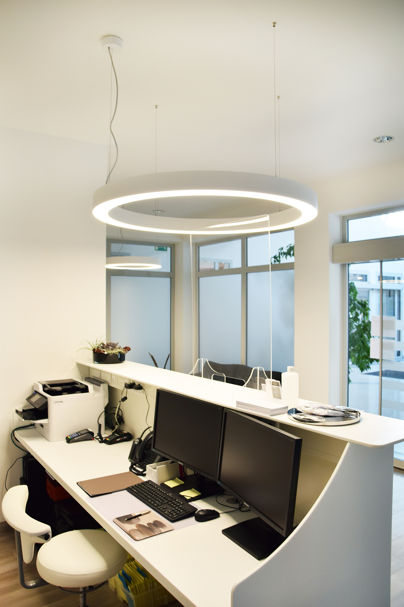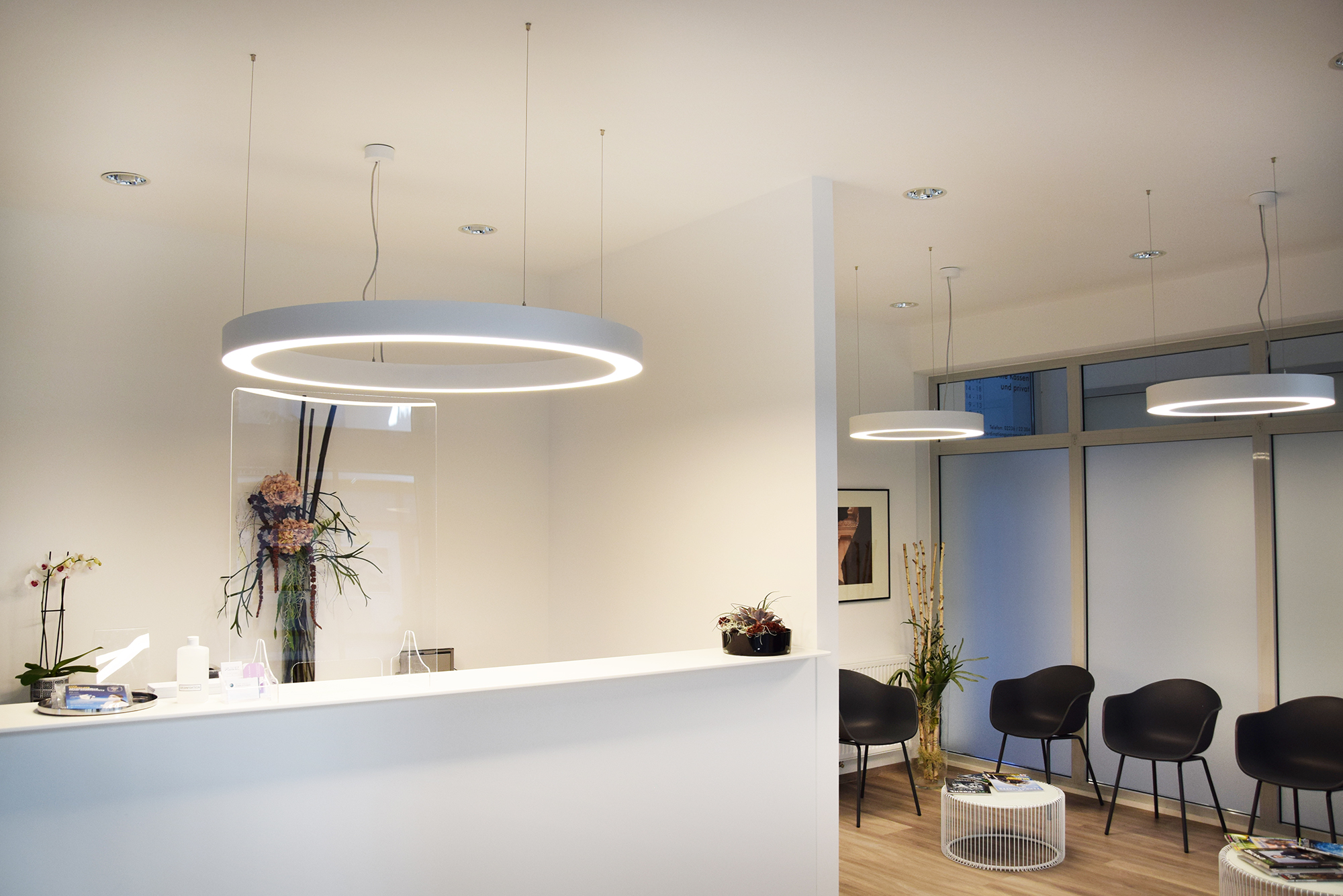 The striking HALO2 pendant luminaires also provide precise accents in the architectural surroundings of the reception and waiting room.