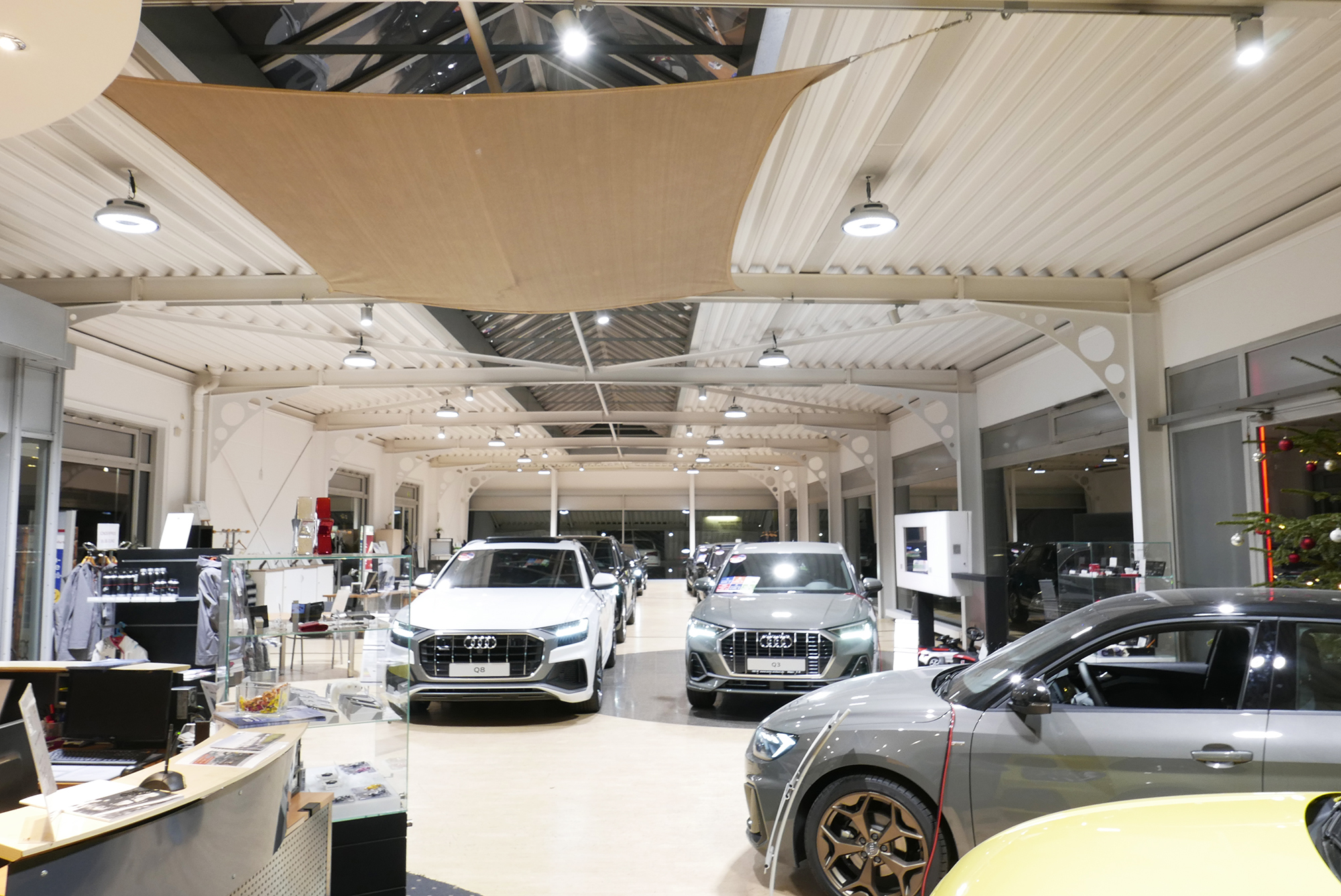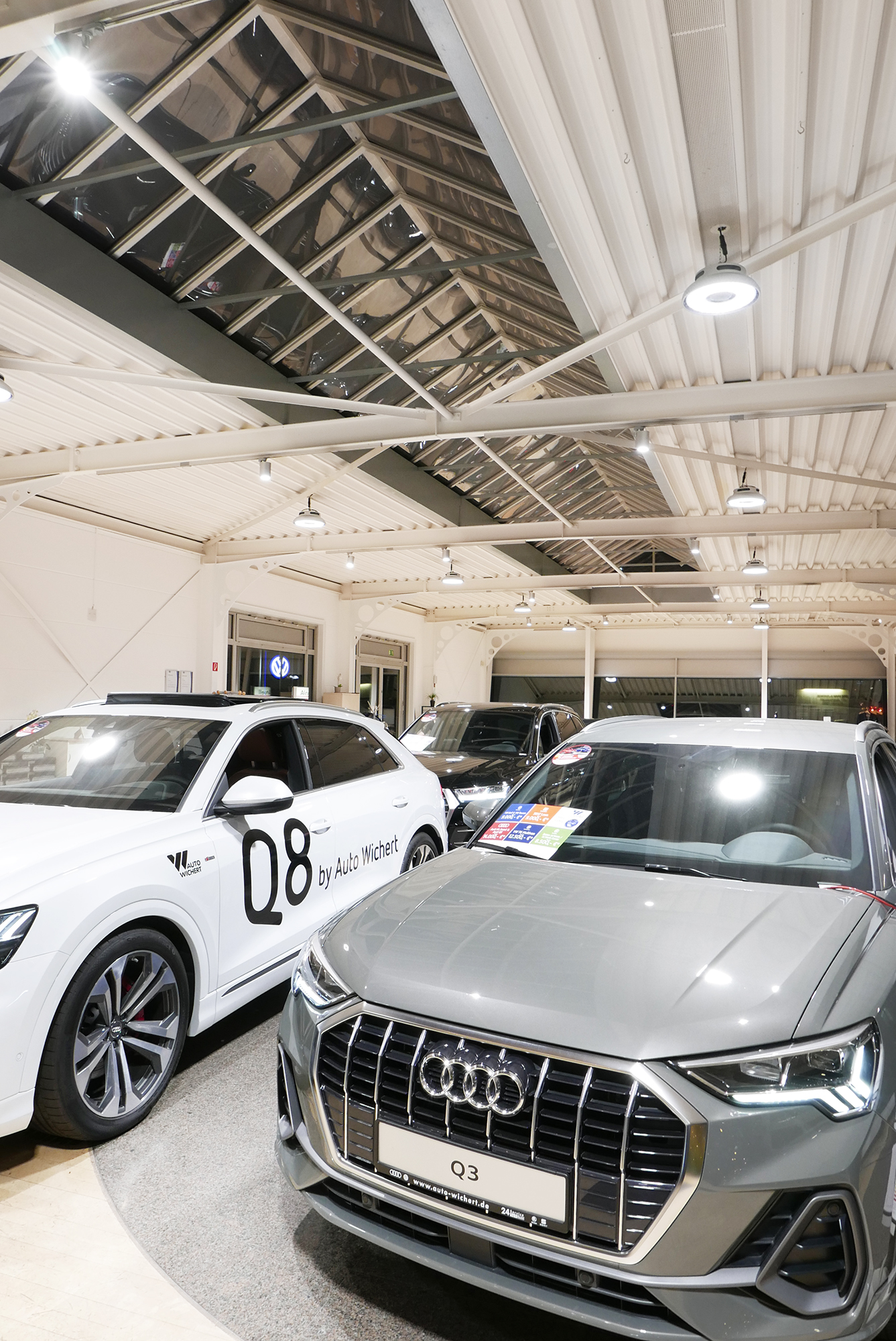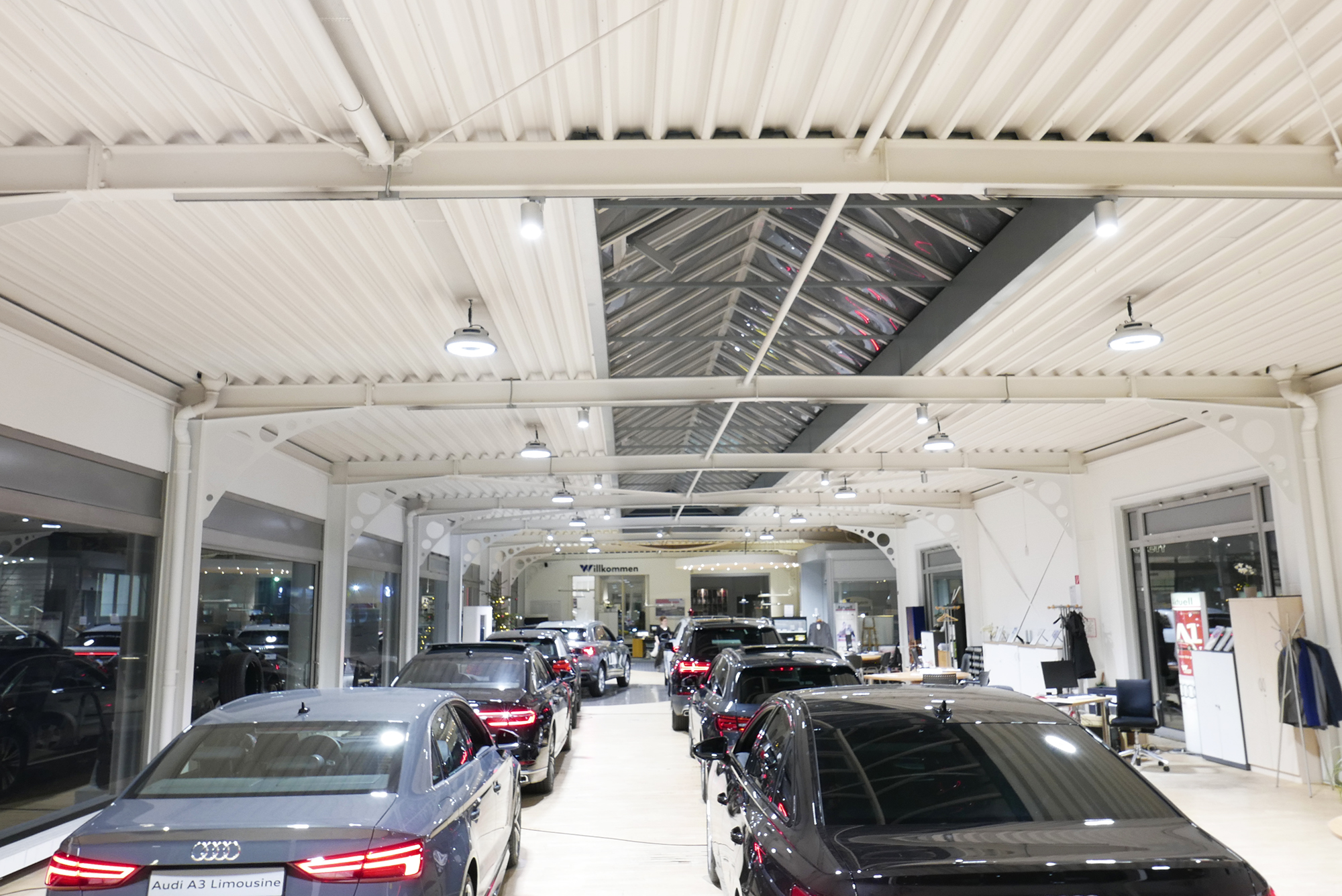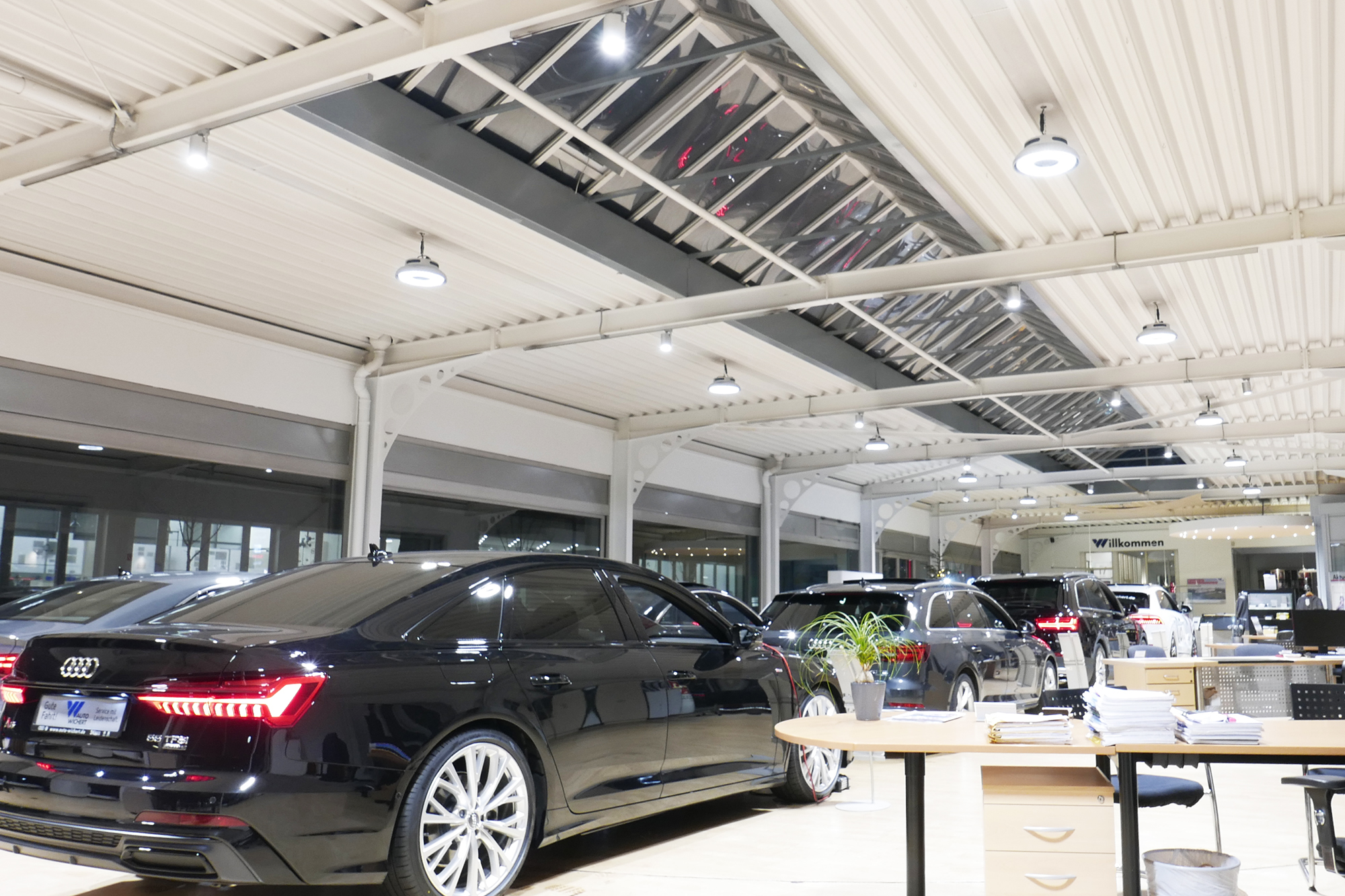 Our HB2 high-bay luminaire provides the basic lighting for the optimum presentation of the vehicles in the sales area and the WAVE spotlight provides accents.